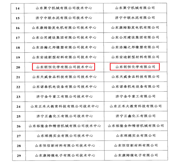 近日,根據《山東省企業技術中心認定管理辦法》(2021年修訂)(魯發改高技〔2021〕428號)和《關于組織申報2023年濟寧市企業技術中心的通知》有關規定,經在線初審、信用核查、專家評審等環節,濟寧市發改委公布了濟寧市2023年第二十二批新認定市級企業技術中心名單,山東朗恒化學有限公司被認定為濟寧市“市級企業技術中心”。